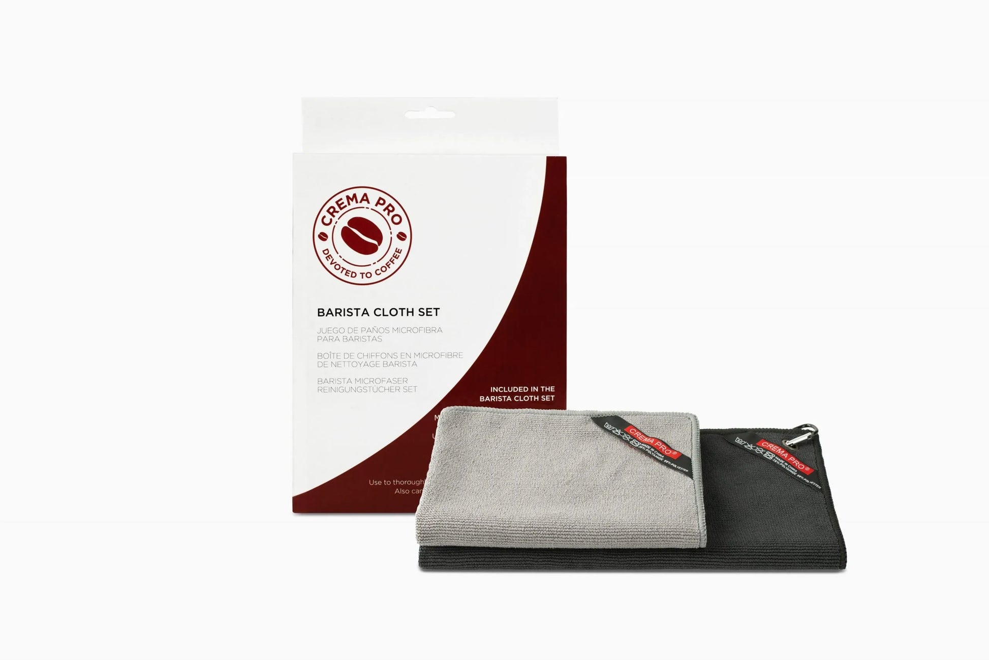 - WHAT'S INSIDE? | The Crema Pro Barista Cloth Set includes 1 x Micro Fibre Cloth 600mm x 300mm (with Barista Clip) for removing and cleaning grind from porta handles.and baskets and 1 x Micro Fibre Steam Wand Cloth 400mm x 400mm for cleaning the steam wand to remove milk residue.